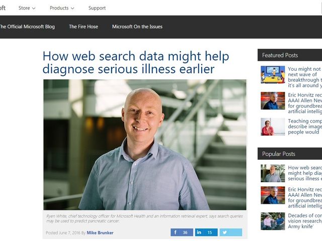 この研究は、MSの基礎研究機関「マイクロソフトリサーチ」のエリック・ホロビッツ博士、ライアン・ホワイト博士と、コロンビア大学大学院博士号取得候補者のJohn Paparrizos氏によるもの。医療関係者向け情報誌「ジャーナル・オブ・オンコロジー・プラクティス(腫瘍学実践ジャーナル)」のウェブサイトに7日、論文が発表された。
