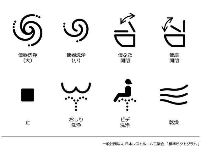 原因の一つとして、トイレの操作パネルのピクトグラム(絵記号)が各社独自のものであったことが指摘され、TOTO、パナソニックなどの国内主要メーカー9社が、共通のピクトグラムを策定したという。今年4月以降に販売されるトイレから採用され、「便ふた開閉」「便座開閉」「便器洗浄(大)」「便器洗浄(小)」「おしり洗浄」「ビデ洗浄」「乾燥」「止」の8つの基本操作に関する表示が共通化される。将来的には世界標準になることを目指すとのことだ。