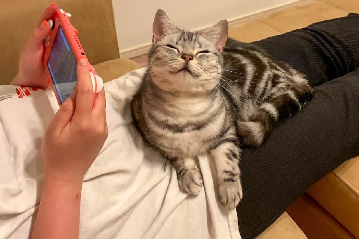 【画像】「ここは極楽だ!」ゲーム中の飼い主の上にいる猫