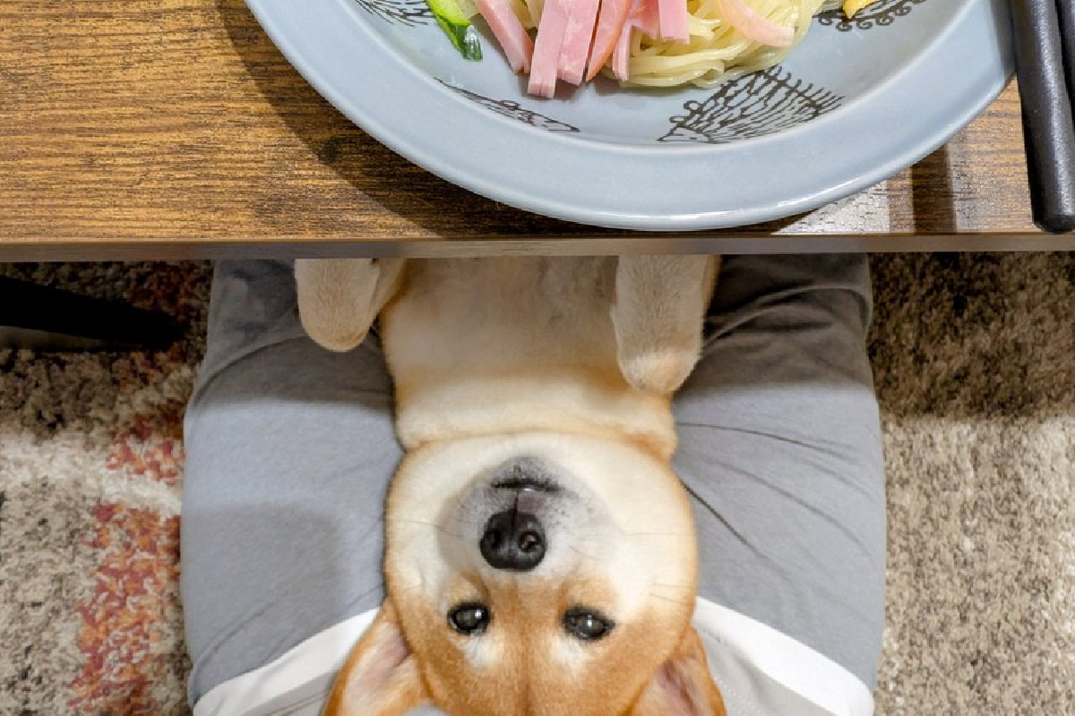 【画像】「笑かしにきてる」冷やし中華の下にいた犬