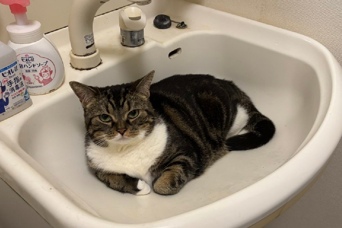 【画像】「ここ、使ってます」洗面台を独占する猫