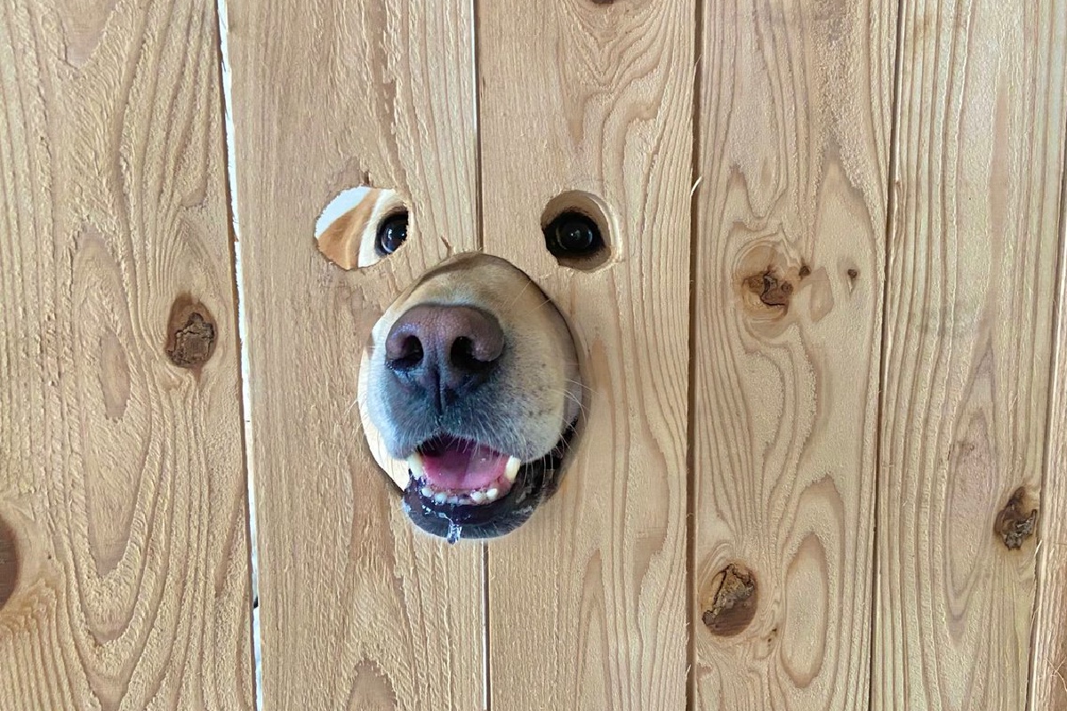 【画像】ぴったりすぎる! 板に開いた穴をのぞいていた愛犬