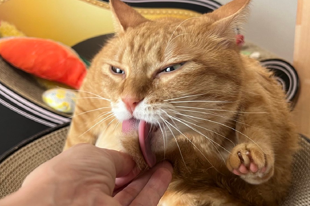 【画像】厚い信頼関係だ! 毛繕い中飼い主に身を任せる猫