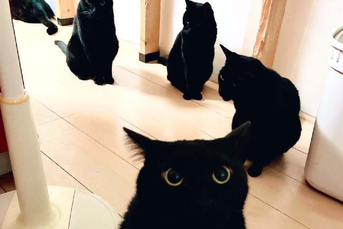 【画像】1匹が動いた後かと思ったら… 「コピペ」のように並ぶ黒猫