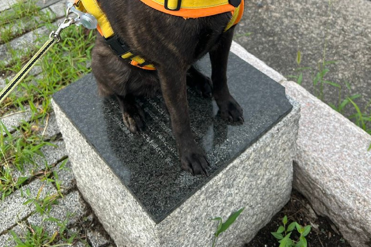 「降りません!」 台座の上でじっと動かない犬