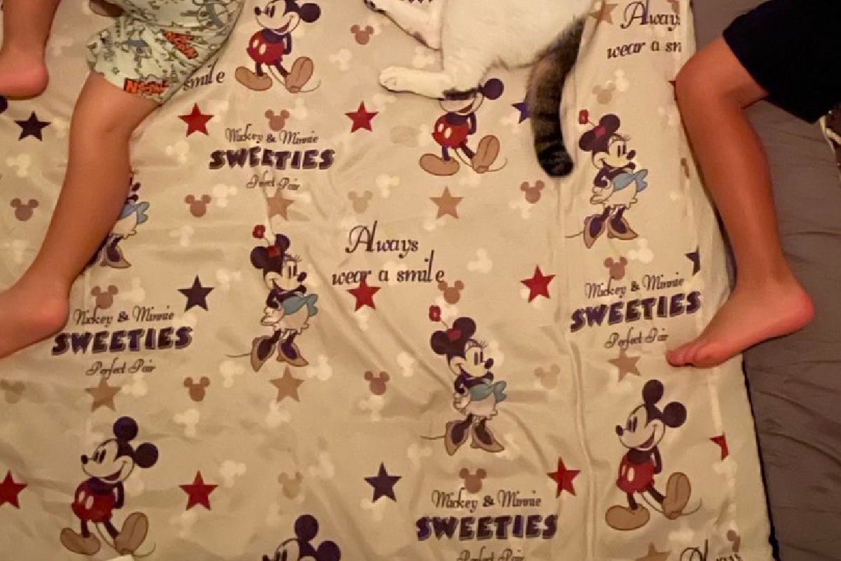 「完璧な配置!」 子供と猫が布団の上で寝る様子に癒される