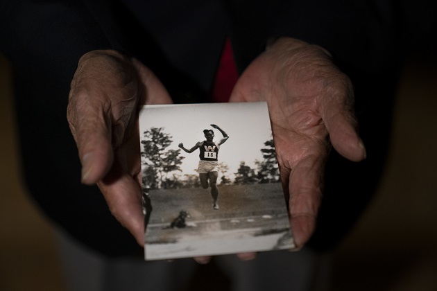 織田氏の人生と栄光は、黄ばんだ家族アルバムのなかに残されている。和雄氏は、両掌で包みこむようにして、一枚の小さなスナップショットを見せてくれた。約一世紀前に撮られたその写真には、三段跳びに挑む幹雄氏が空を舞う瞬間が見事に捉えられていた。