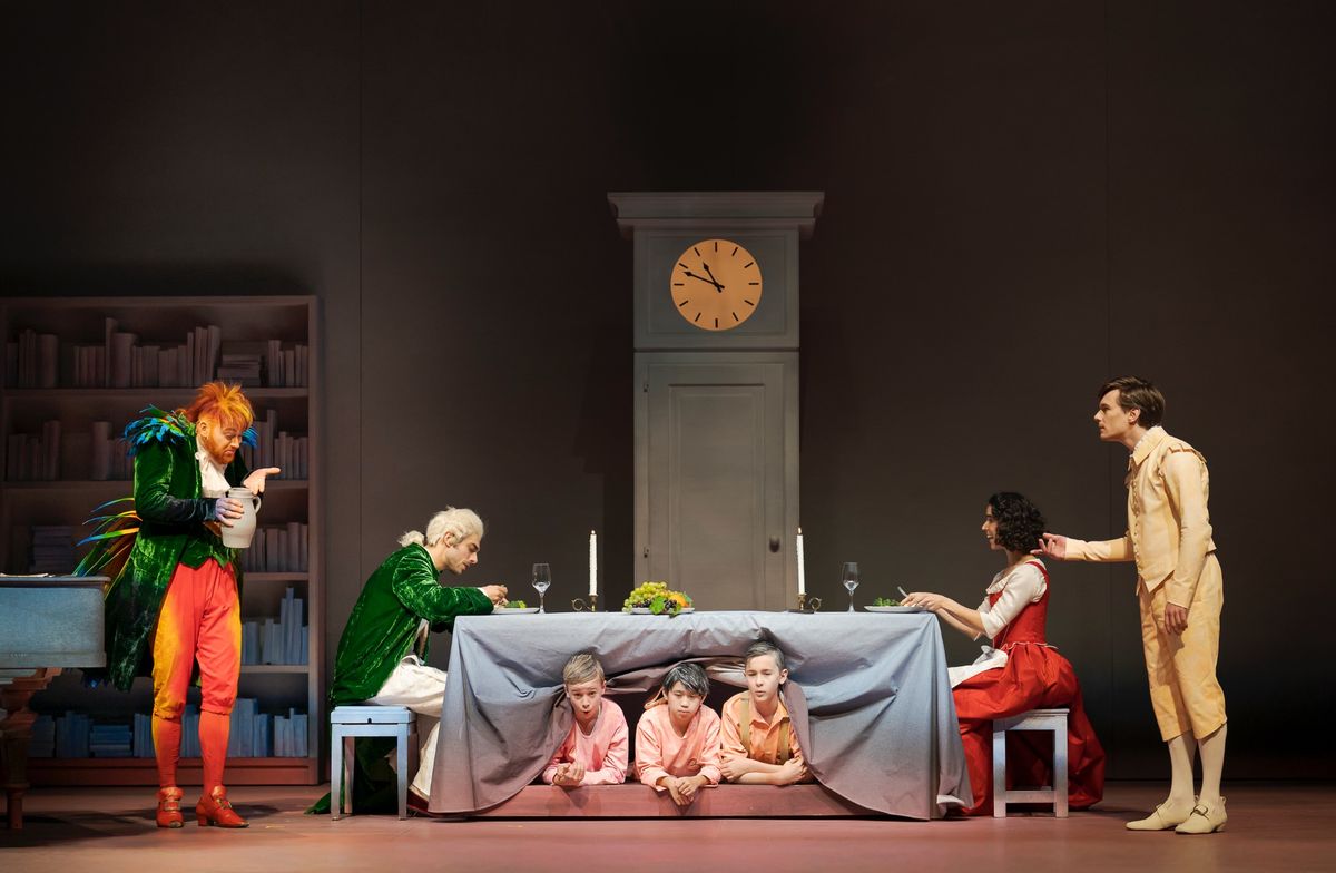 左から鳥刺しパパゲーノ、モーツァルト、3人の童子、妻コンスタンツェ、タミーノ|@Werner-Kmetitsch