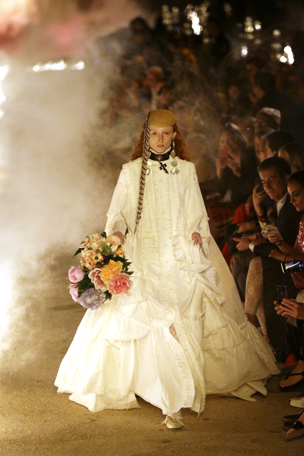High-collared — almost ghoulish — Victorian gowns fluttered past with hanging crucifix pendants. Ethereal models wore hair ribbons, thick velvet dresses and weighty embroidered capes, sometimes holding large bouquets of white flowers.