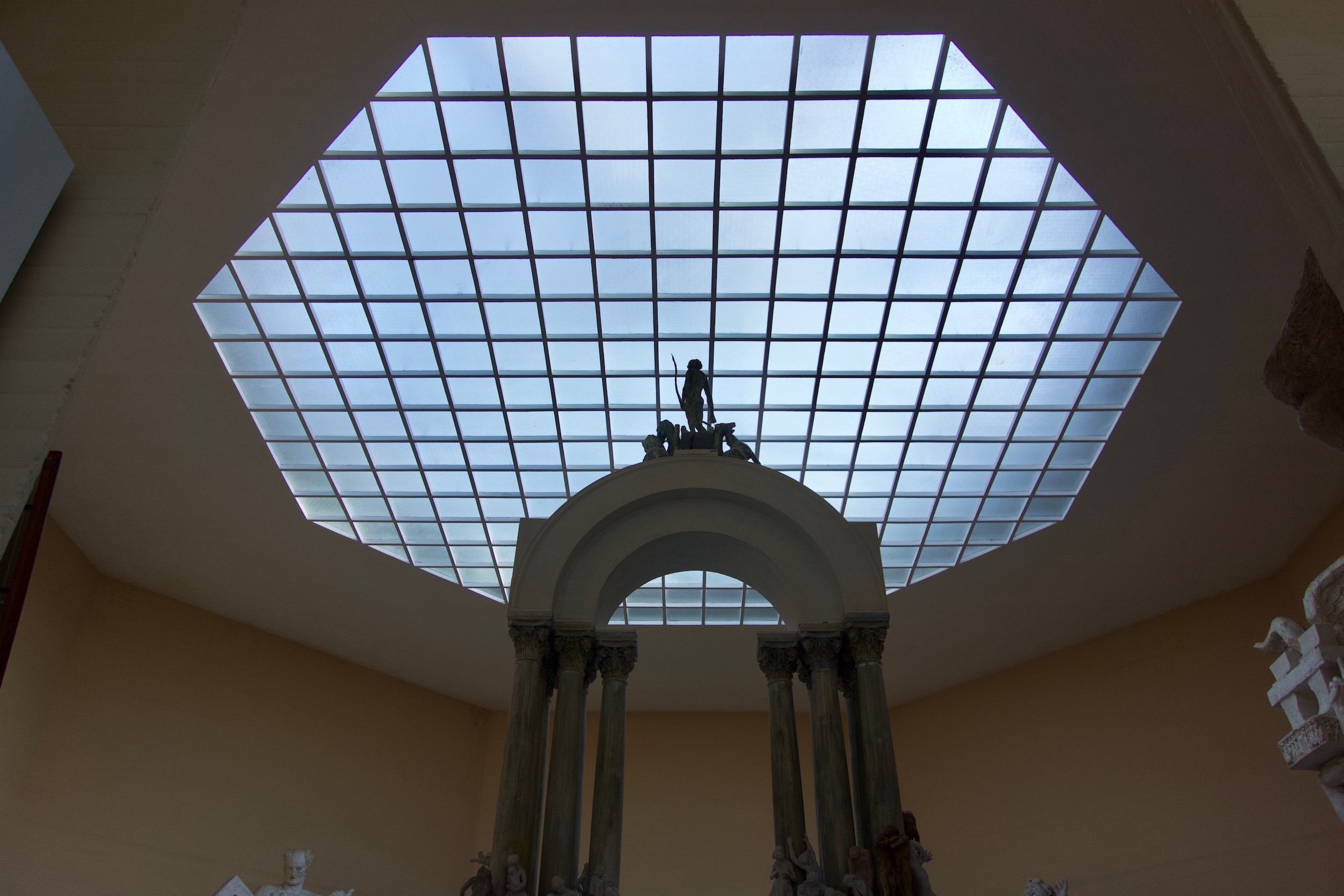 建築には、火災が起きないようにとコンクリートを選び、より自然を身近に感じられるようにと天井にはガラスを用いて造られている。外の日の光が差し込み心地よい空間だ。