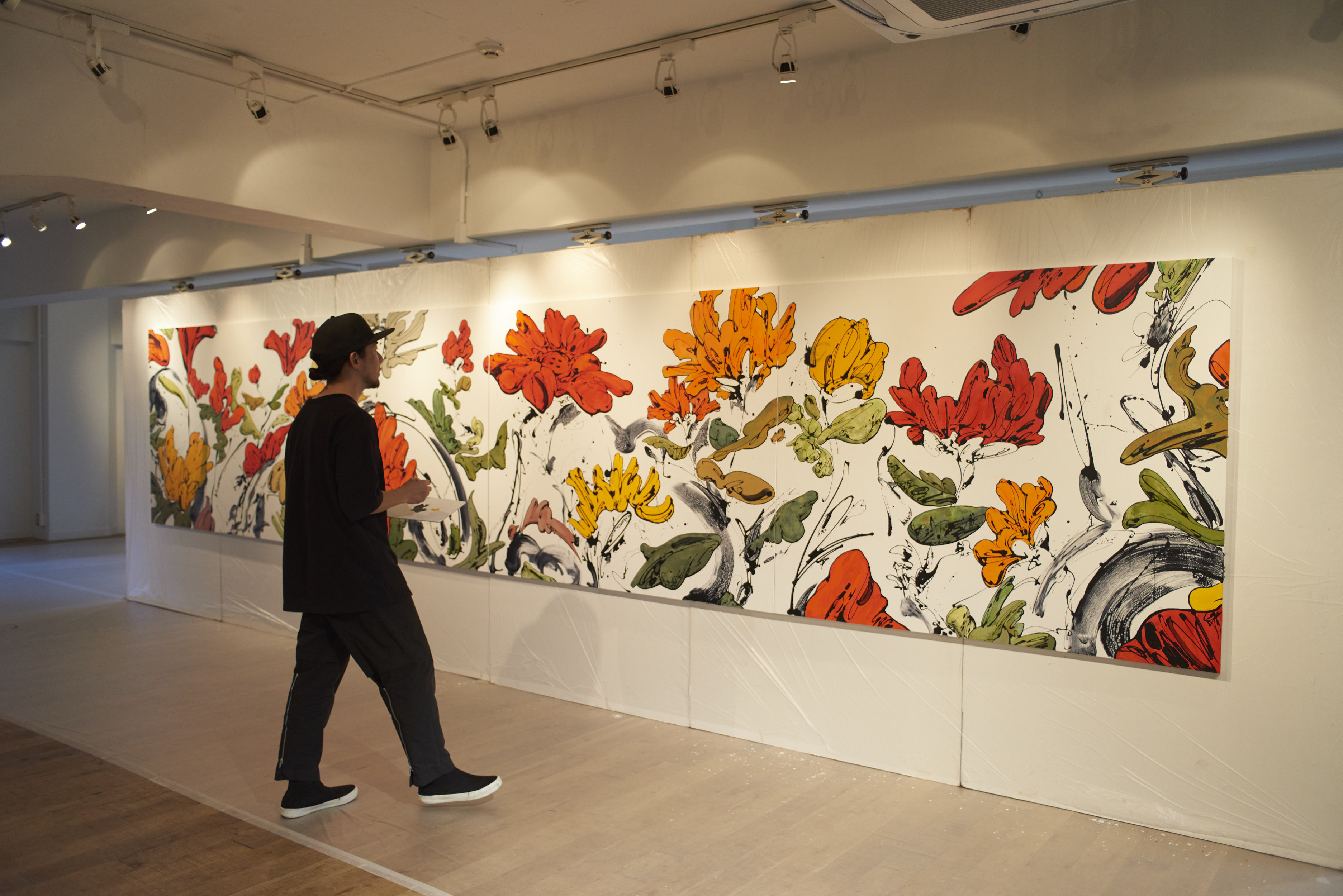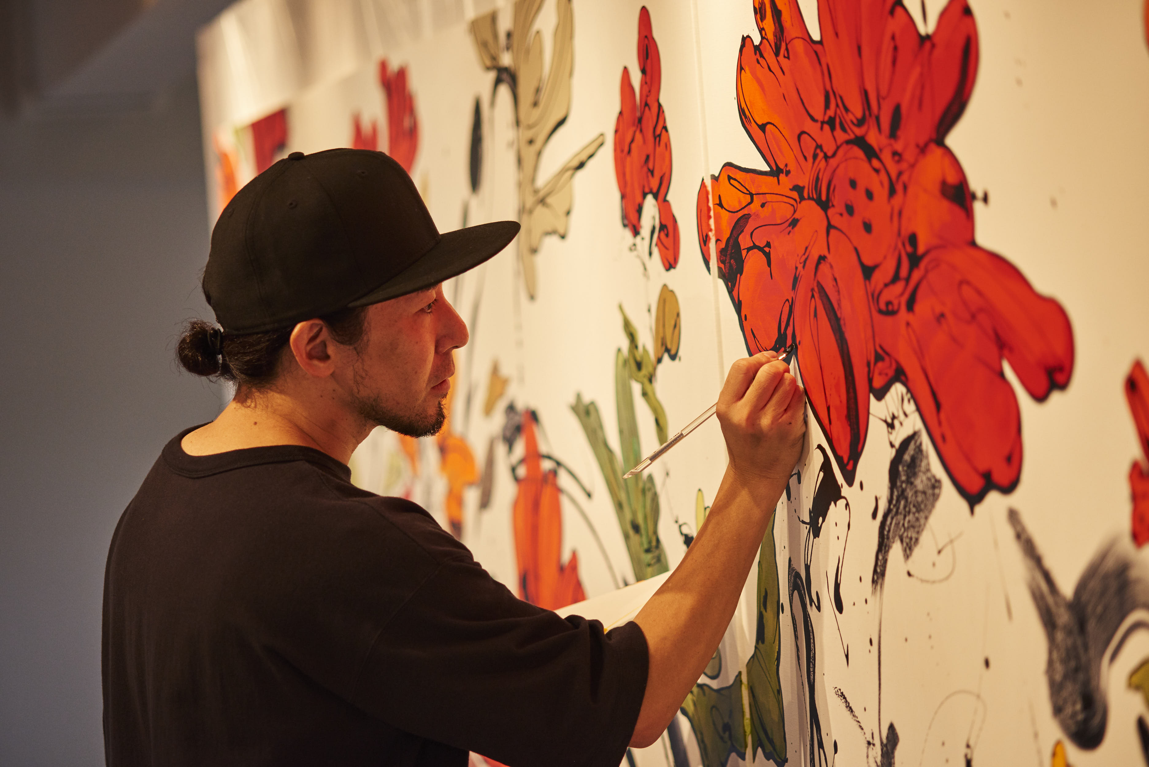 完成した新作には、たくさんの「ボタンフラワー」が描かれていました。カラフルで、楽しくて、それでいてSUDOさんらしいインパクトのあるモチーフだと思ったのですが、なぜ花の真ん中に「ボタン」があるのですか?