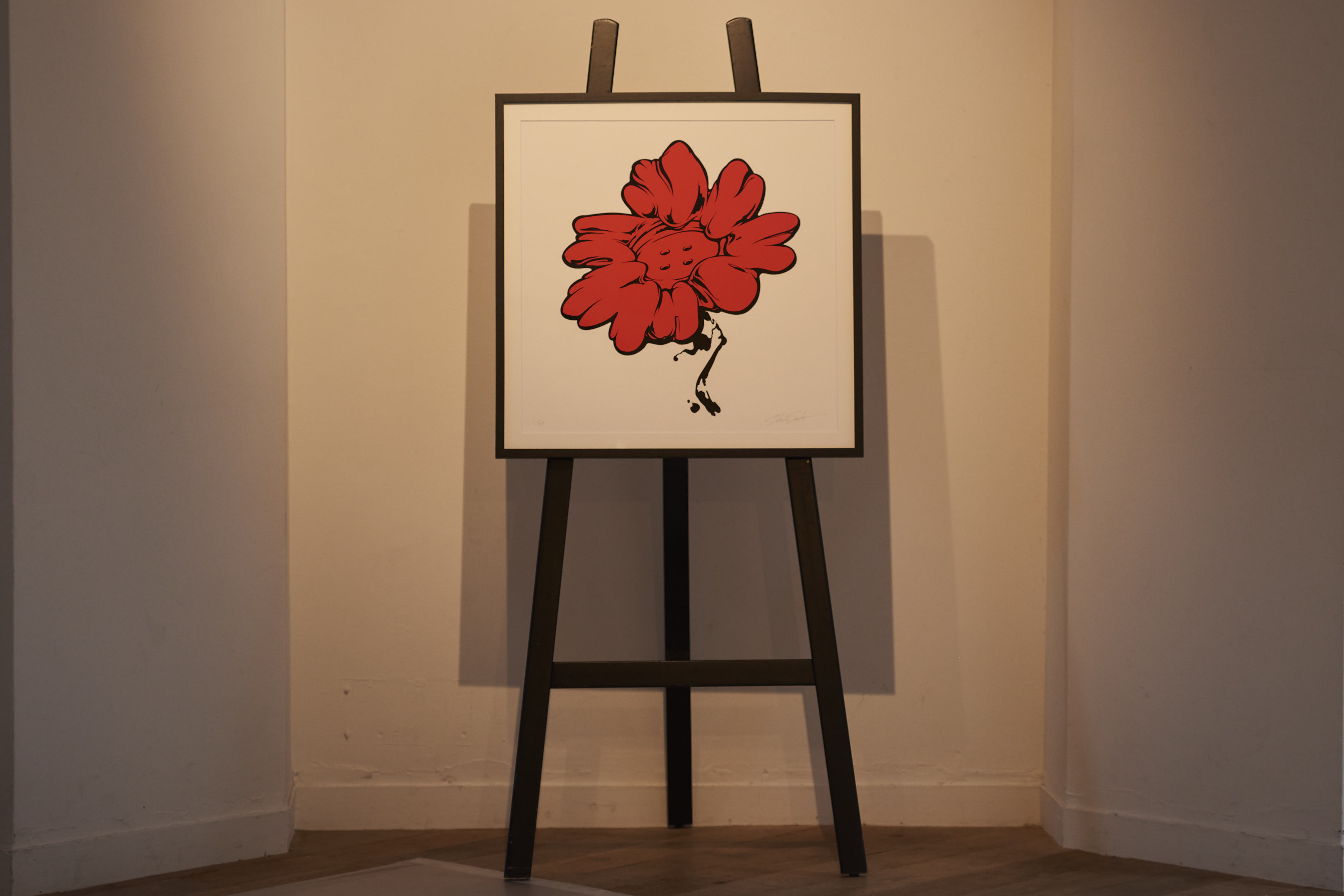 最初は、単純に「花の中心にボタンがあったら面白いな」程度のことだったんです。いままでよく描いていたスマイルマークの様に。ウォーホルの絵を描いた時には、彼の代表作でもあるキャンベル・スープの缶の蓋の部分を花の真ん中に入れたりしていました。なんか、そういう遊びだったんです。でも、だんだん意味合いとして、自分の中で、「結構ピースな感じを入れ込んでいたんだな」とわかって。