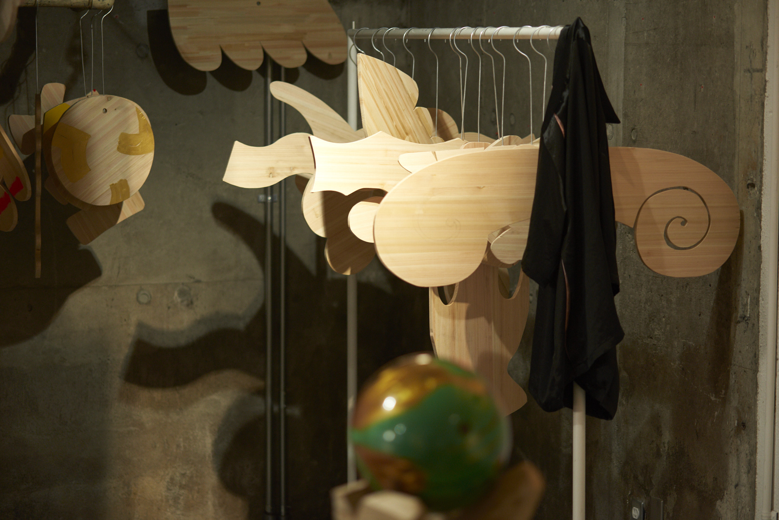 そう、ハンガー付きシャツじゃなくて、シャツ付きハンガー(笑)こちらは、今回の展示スペース「ギャラリー月極」のオーナーがデザイナーなので、一緒に遊んでみたかったんです(笑)ハンガーを購入した人は、オリジナルボウリングシャツのサイズと色が選べます。