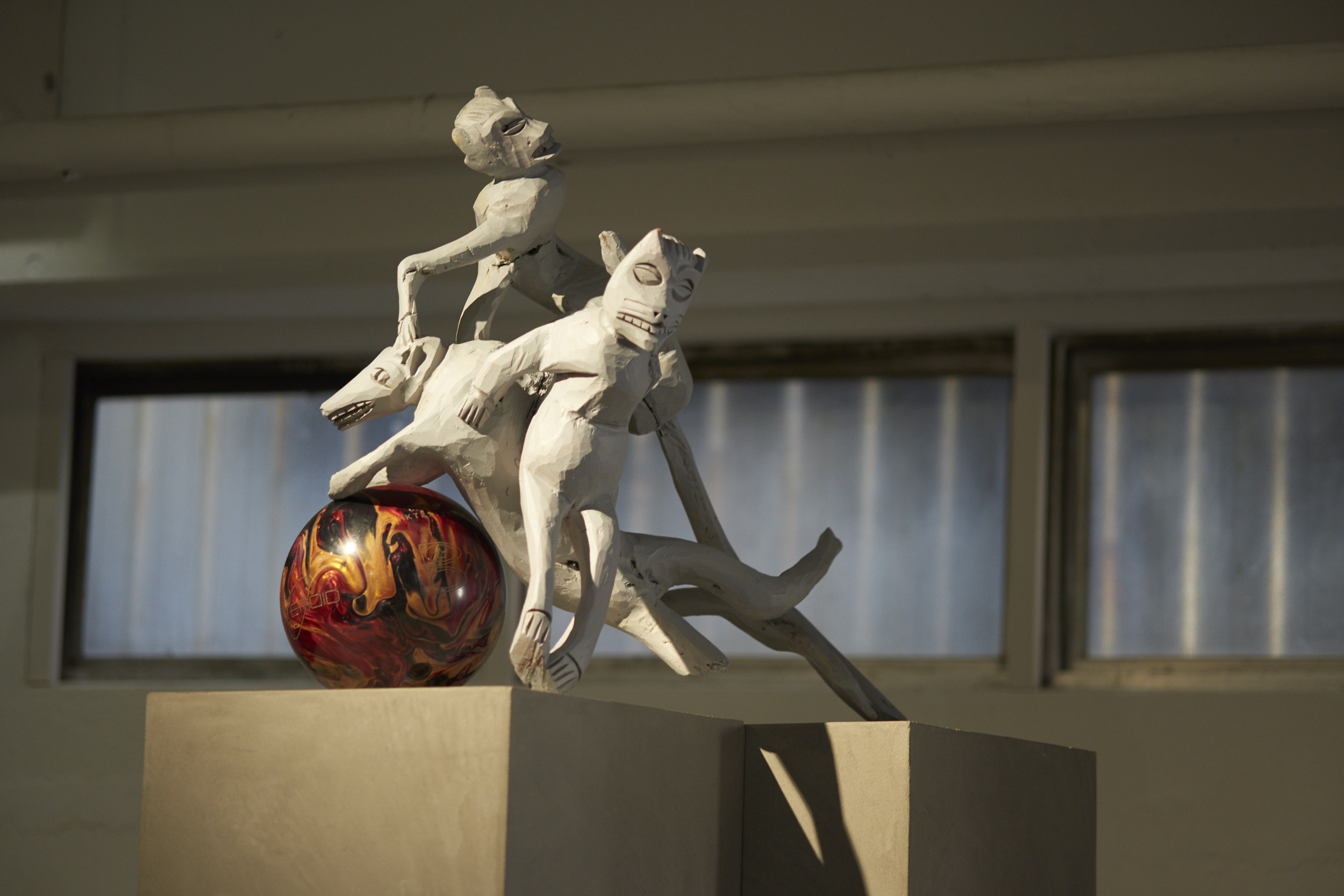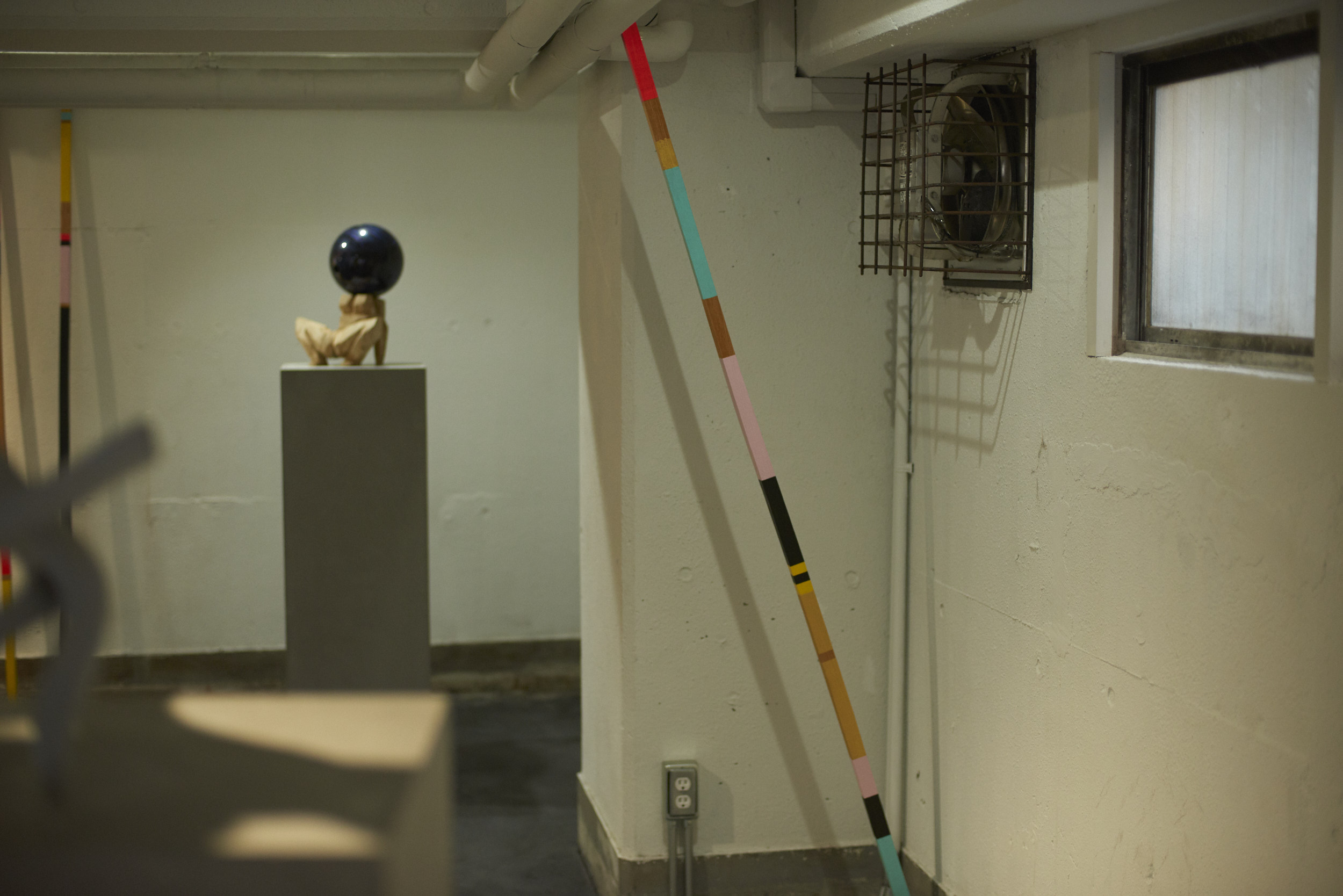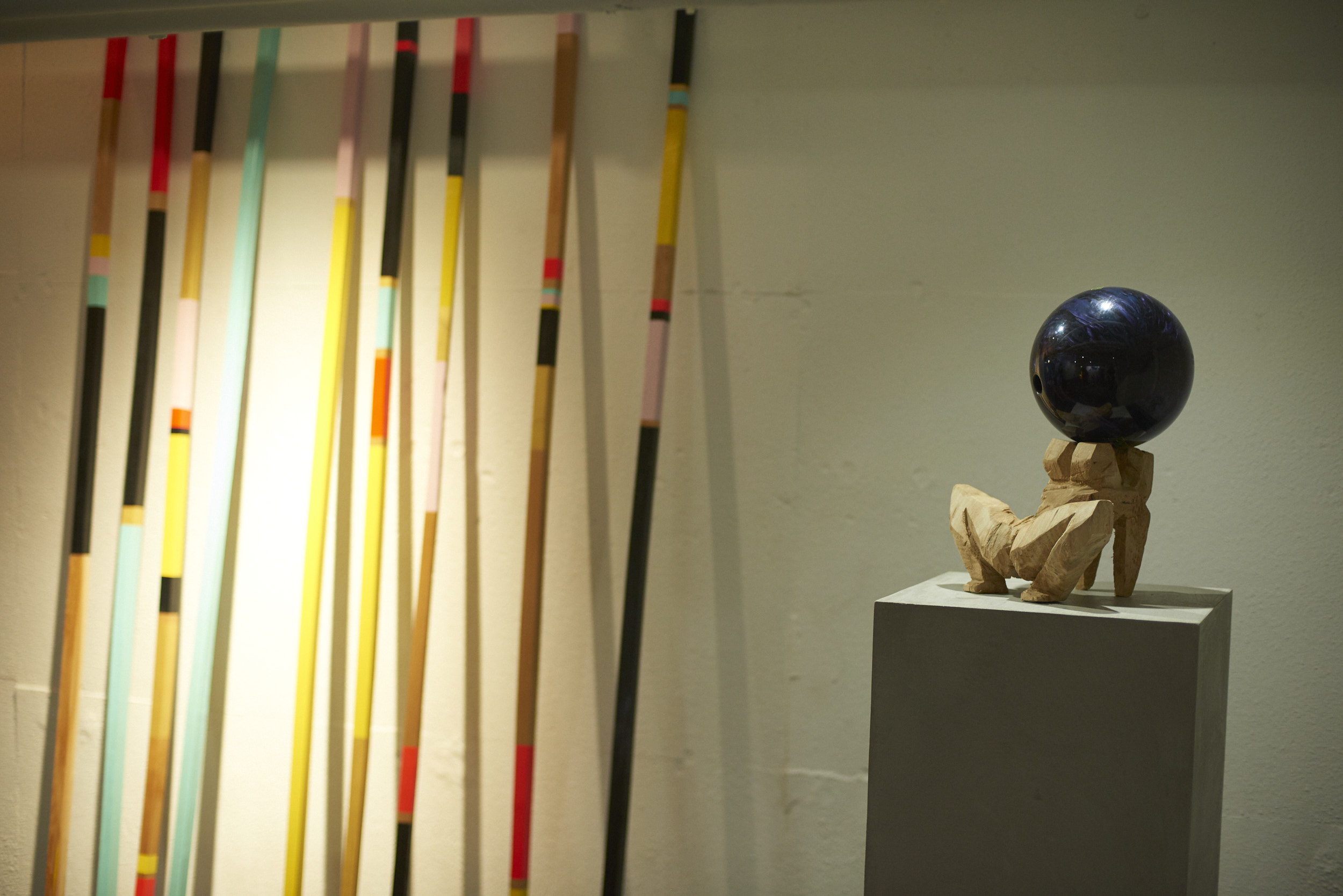 はい。「ボウリングピン」も、こういうサイズの棒を買ってきて塗ったわけではなくて(笑)丸太からチェンソーで切り出しています。他の木彫も、彫刻刀などは使用せず、全部チェンソーで作った作品です。今回は時間をかけて一つの完成度をあげるというより、自分のイメージしているものを現実化して、それを繋げるということに集中しました。あまり考えすぎると想像以上にならないので、作っている時も最終イメージを決めないでやりました。