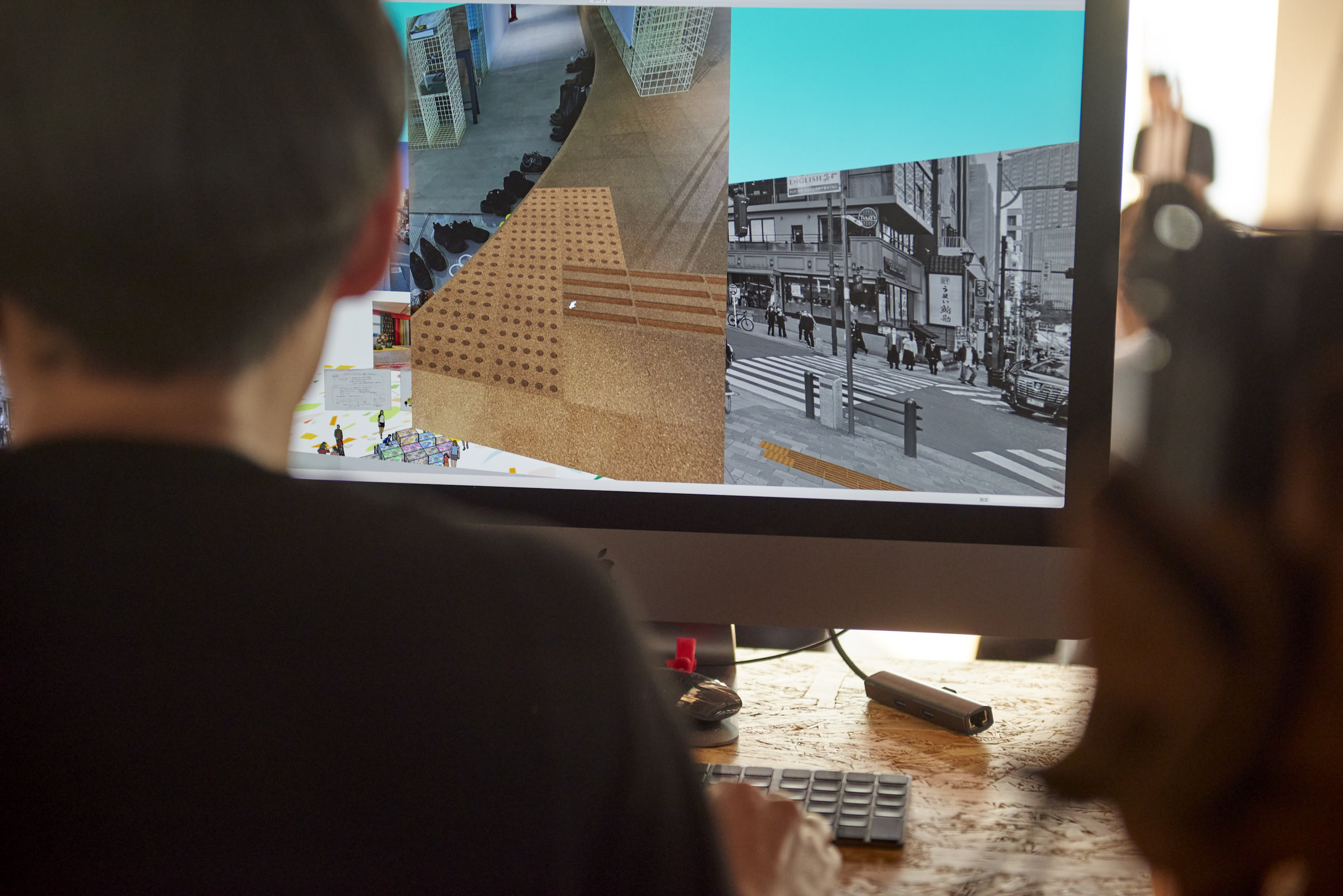 授賞式の後は、カタリストを交え、アイデアの感想や赤坂の街でどのように実装していくかのディスカッションが行われた。UoCのプロトタイピングチームがその場でプロトタイピングをしながら、さまざまな案をバーチャル空間に配置していく。ディスカッションが行われたUoCの広々としたスペースの一角は、「マンダラ」と呼ばれる、コルクが敷き詰められた緩やかな曲線を描く段差のある心地よい空間だった。ここでは肩書きや専門を超えて対話を行い、さまざまな創造を生み出していこうという想いが込められているそう。コルクの柔らかい質感は温かみがあり、気持ちをリラックスさせてくれた。