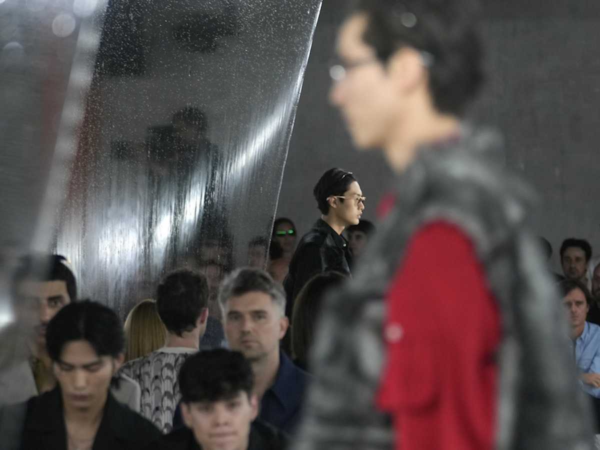 The collection was viewed through a wall of clear falling slime — a form of fluid architecture — that gathered on the metallic grate runway in piles of green foam. The moving architecture was a metaphor for a collection that was meant to express the fluidity of menswear.