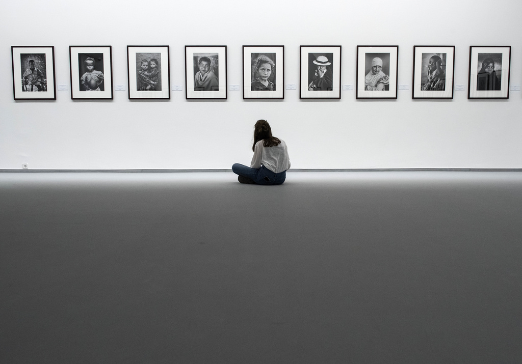 ドイツで開催された『Exodus(エクソダス)』展にて、子どもたちの肖像写真の前に座る来場者。AP Photo/Jens Meyer, file 2017年