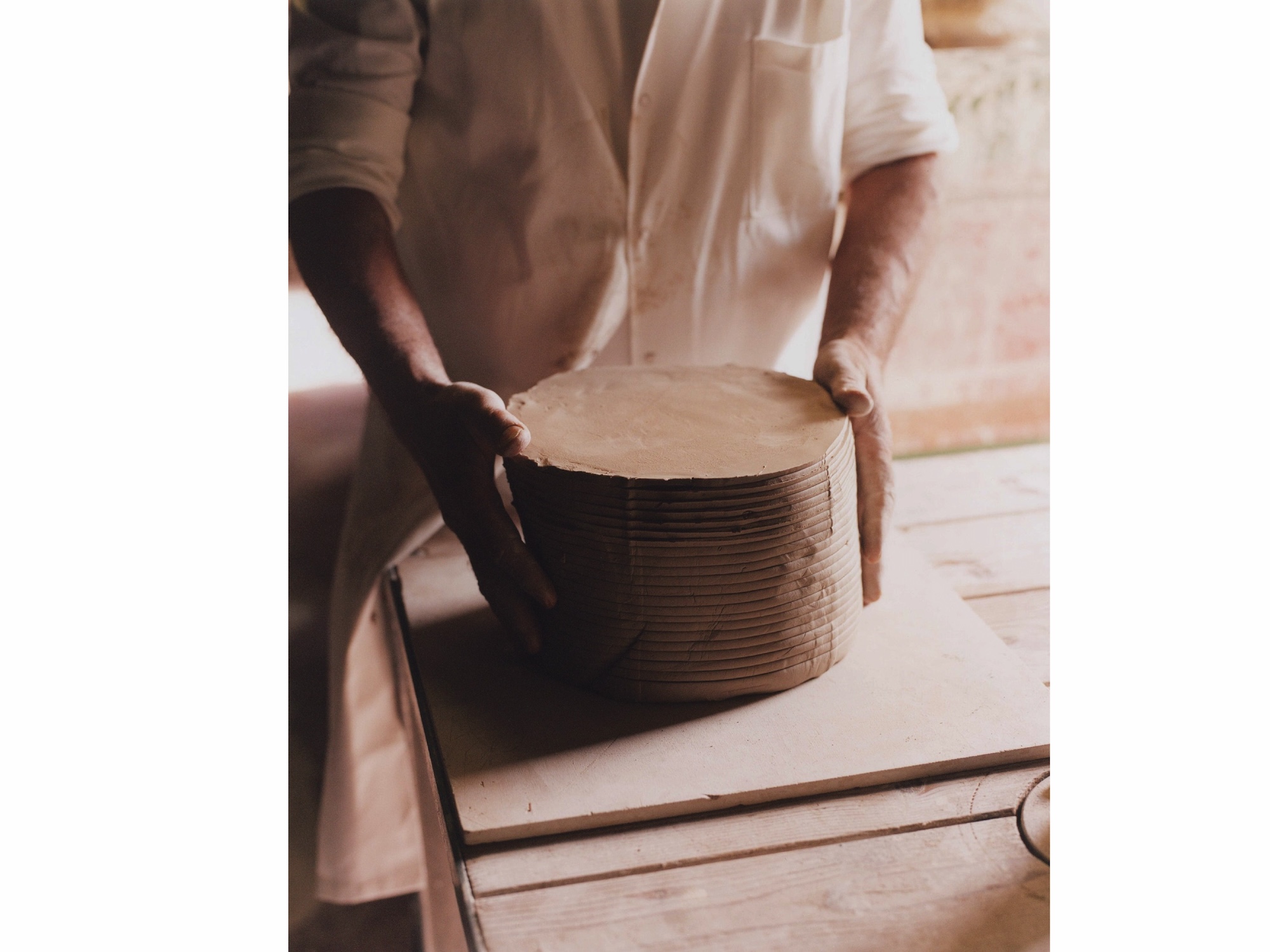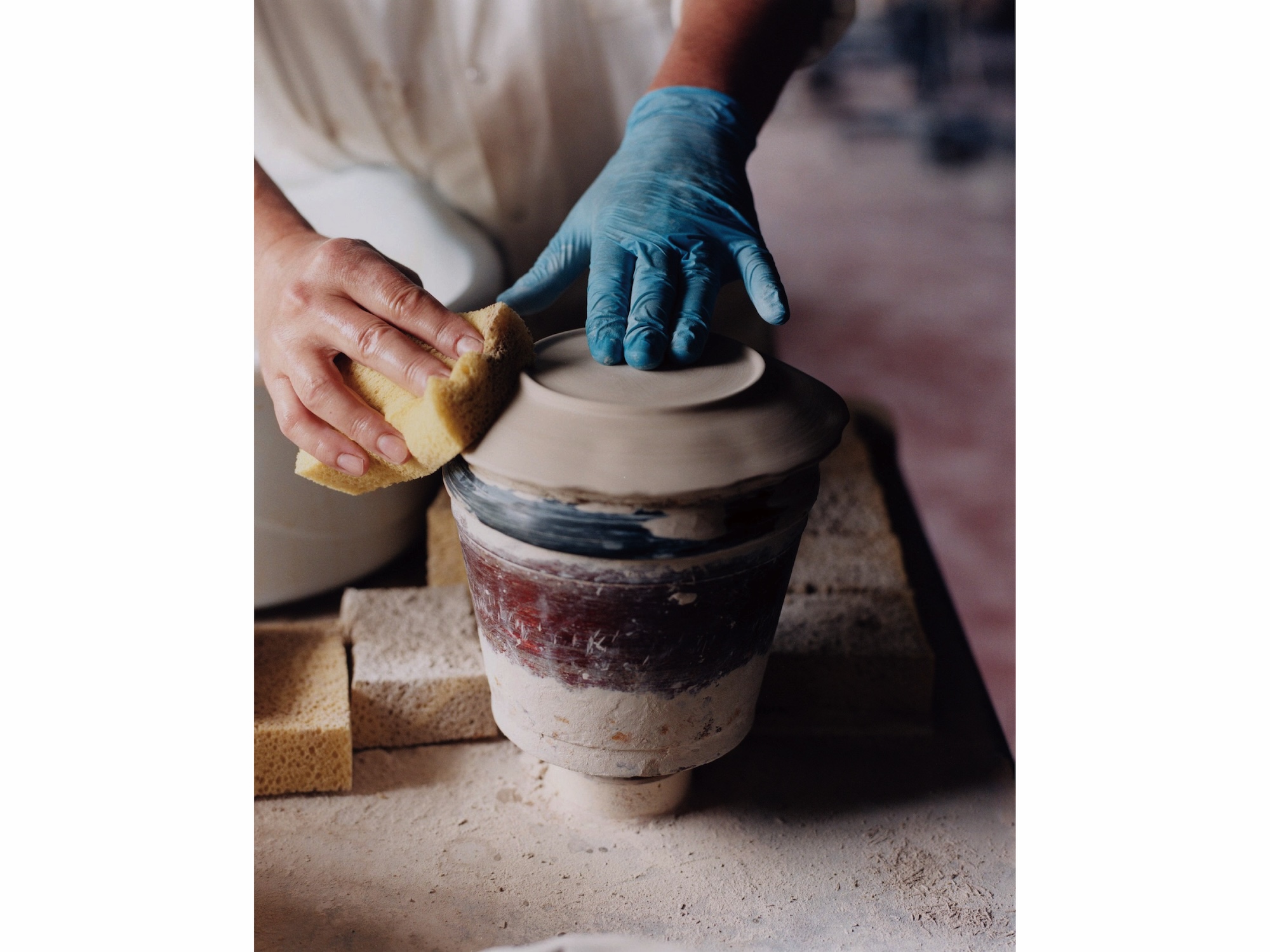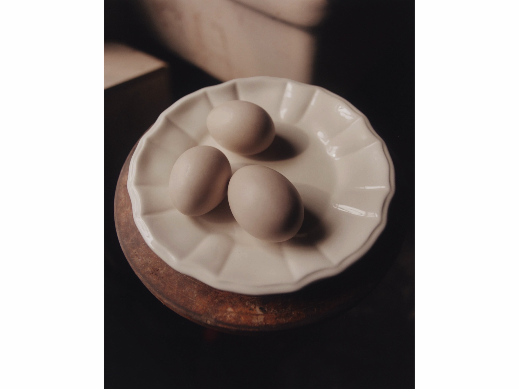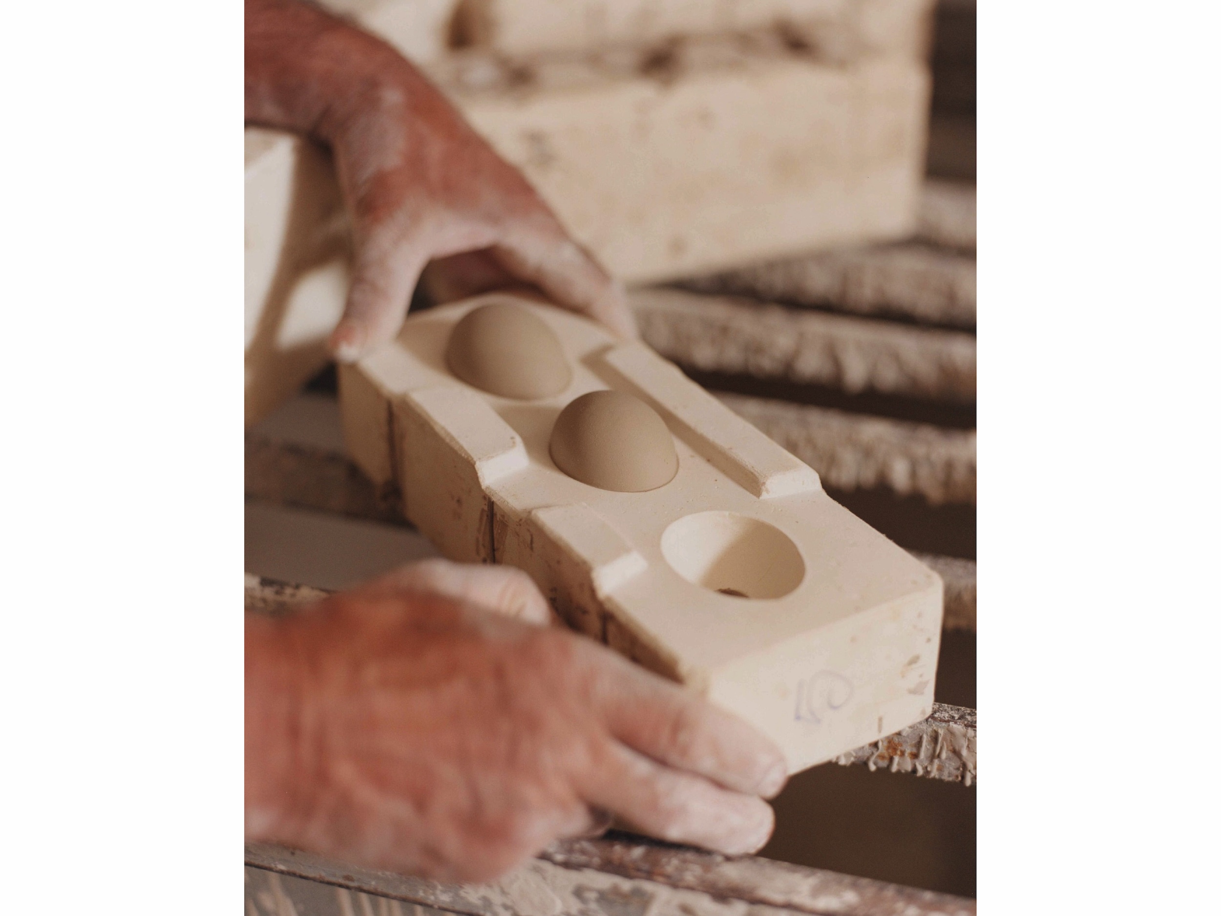 制作はイタリアの工房で行われた。手作業で設計・彫刻された型をもとに、削り、磨き、研磨といった工程を経て、陶器は静かにその輪郭を獲得していく。さらに3度の焼成によってフォルムが確立され、最後に施されるのは、ニスとエナメルの繊細なレイヤー。熟練した職人の手によって重ねられた色彩は、驚くほどリアルな卵の質感を生み出し、卵の殻の質感を繊細に際立たせる。限りない細心の注意を払って生み出されたこれらの作品は、それを形にした手仕事の美しさと、フォルムの詩情を余すところなく表現している。