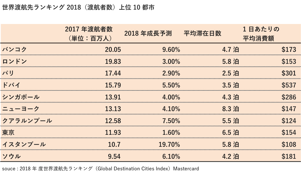 年間約2,000万人の渡航者が海外から訪れるバンコクが渡航者数では1位となり、2018年には9.6%の成長が予測されている。注目したいポイントは、バンコクを訪れる渡航者は平均で4.7泊滞在し、1日あたりの平均消費額が173ドルであった点だ。手頃な費用なため渡航者の支出意欲が促され、バンコクはパリ、シンガポール、ソウルよりも旅行しやすい都市として見られる一方、2位にランクインしたロンドンよりも消費額が多くなっている。