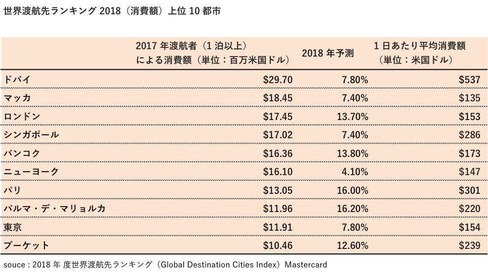 消費額の視点でみると、ランキングは少し違う。1位には昨年に続きドバイが選出され、1日あたりの平均消費額は537ドルと他国に比べて飛び抜けて高い。なお、シンガポールやバンコク、東京などアジア太平洋の4つの都市もトップ10に選出されている。