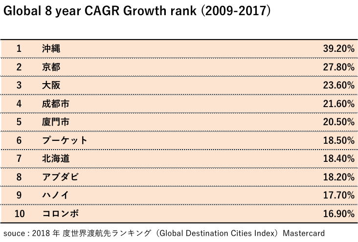 日本の都市として注目したいのは、渡航者が急増している都市という視点だ。2009年から2017年の過去8年間の年平均成長率で見ると、日本の都市がトップ3を独占している(沖縄が39.2%、京都が27.8%、大阪が23.6%)。なお、4位には成都市 、5位には廈門市と続き、7位には北海道がランクインしている。日本の都市の急成長は、レジャーの誘致に力を入れていることなどが考えられる。
