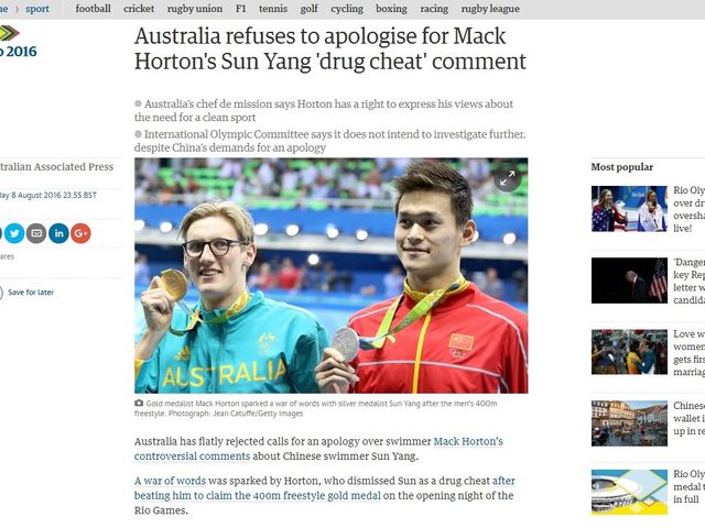 リオ五輪の水泳男子400メートル自由形で金メダルを獲得したオーストラリアのマック・ホートン選手が、前回大会の自由形400メートルと1500メートルの覇者、中国の孫楊選手を「薬物不正使用者」と呼んだことが、波紋を呼んでいる。中国チームは謝罪を求めているが、豪チームはその意思はないとしている。次第に中国メディアや中国人の怒りの対象は、オーストラリア人全般に拡大。平和の祭典が2国間の対立を引き起こしかねず、次の開催国日本としても、見過ごせない事件だ。