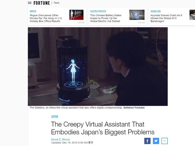 一方でフォーチュン誌は、本商品を「Icky(日本語で言うなら”キモい”)」と表現した。ただし、「それだけではない」と続ける。「働きすぎの若い男性がロボットに交流を求めてしまうこの疎外感は、日本の風土病だ」と説明する。さらに、日本の生涯未婚率や出生率、高齢化、厳しい移民政策、労働・雇用状況の悪化などの諸問題に触れ、アメリカで作られるホームアシスタント機能なら娯楽性や効率性が重視されるが、日本ではその社会経済状況において、ホログラムでできた妻が必要なのだと結んでいる。