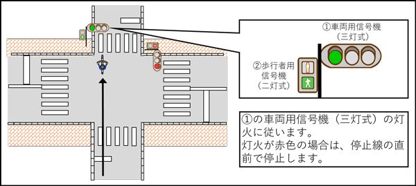 Aは不正解。自転車は原則として車両として扱われるため、歩行者用信号ではなく車両用信号に従う。