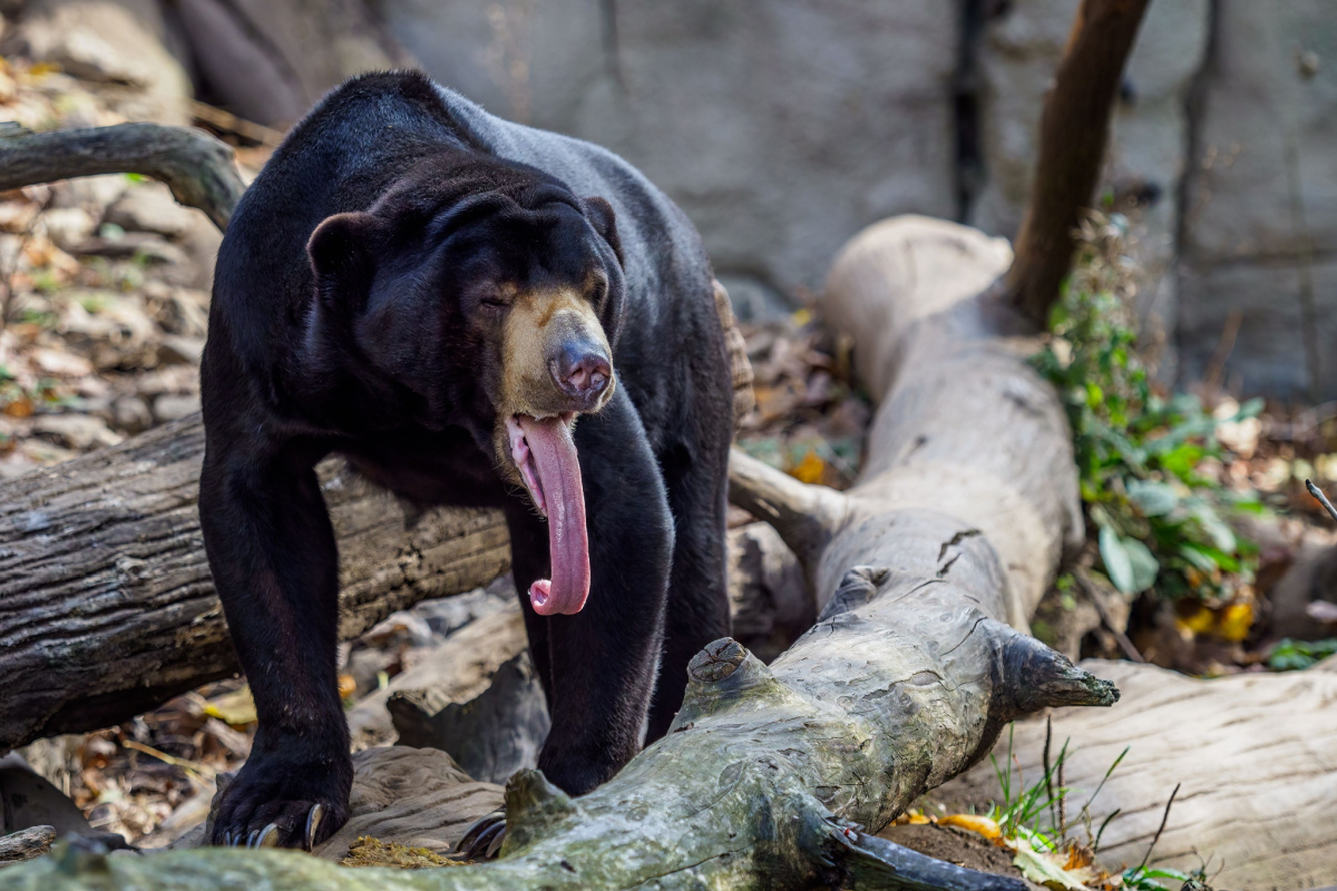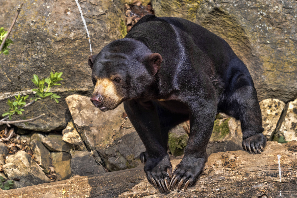 マレーグマは東南アジアの熱帯雨林に生息するクマで、現生のクマ類の中では最も小型とされる。体は小さいが、前脚の筋肉が発達しており、長く鋭い爪と強力な顎を持つ。果実や昆虫、小動物を食べる雑食性で、特にハチミツを好むことから「サンベア」とも呼ばれる。単独行動が基本だが、気性は荒く警戒心が非常に強い。視界の悪い密林で突然遭遇した場合、体格差に関係なく攻撃的な反応を示すことがあり、小型であることが必ずしも安全につながらない点が特徴だ。