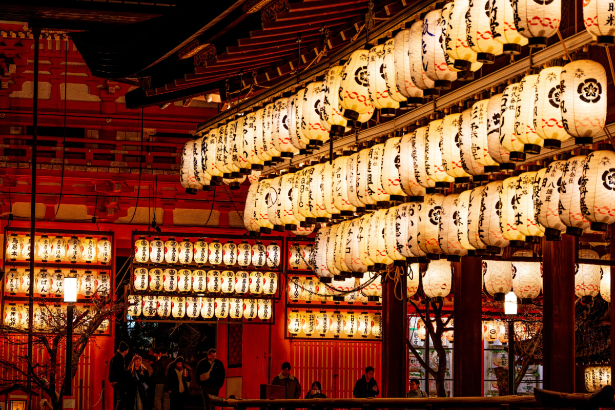 八坂神社は、京都市東山区・祇園の中心に立つ古社で、素戔嗚尊(すさのおのみこと)などを祀る。四条通に面した西楼門から境内へ入ると、舞殿の提灯が林立し、社殿や末社が点在する。境内背後は円山公園へと続き、散策路や季節の桜・紅葉が楽しめる。