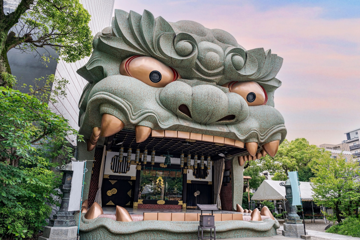 難波八阪神社は、大阪・難波に鎮座する神社で、境内中央にそびえる獅子殿(獅子舞台)が象徴だ。高さ約12メートルの巨大な獅子の口は「災厄を呑み福を招く」と伝わり、商売繁盛や学業成就などの祈願所として親しまれている。