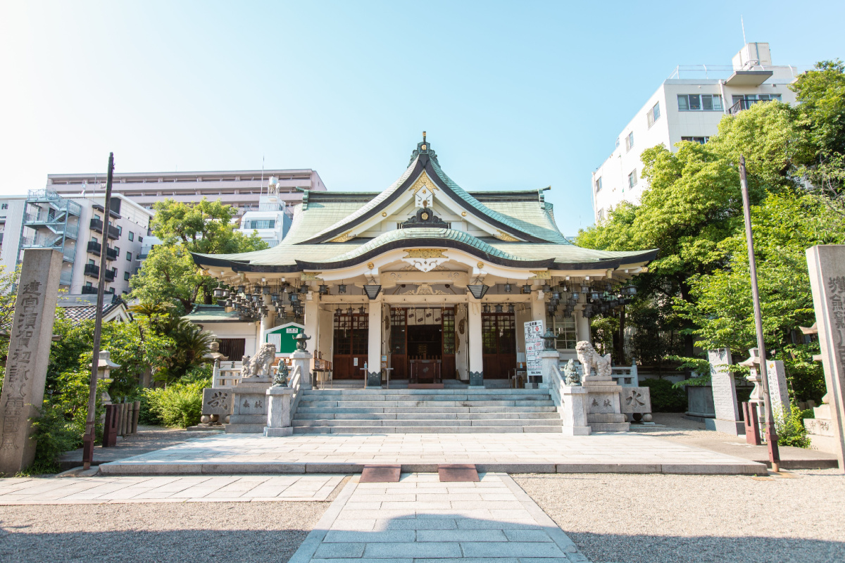 境内は比較的コンパクトながら、拝殿・社務所・手水舎や灯籠、絵馬掛け所などが整い、都市の賑わいの中で印象的な非日常空間をつくる。最寄りのなんば駅から徒歩圏で、周辺の飲食や買い物と組み合わせやすい立地も魅力である。
