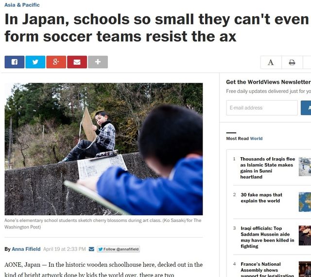 ワシントン・ポスト紙(WP)は、神奈川県相模原市にある青根地区を取材し、少子高齢化の教育への影響を伝えている。