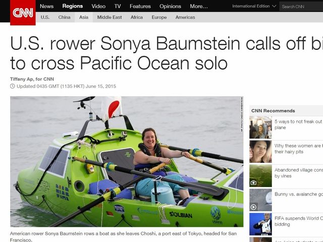 手こぎボートで単独太平洋横断を目指していたアメリカ人女性、ソーニャ・バームステインさん(30)が13日、福島県沖約250kmの海上で救援を要請し、近くを航行していたパナマ船籍の貨物船に救助された。その後海上保安庁の巡視船に引き渡され、15日に福島県の小名浜港に到着した。バームステインさんは、7日に日本の銚子港を出発。3ヶ月半ほどかけて無寄港で米・サンフランシスコにゴールする計画だった。しかし、日本の沿岸を出ることなく、わずか6日目でのリタイアとなってしまった。