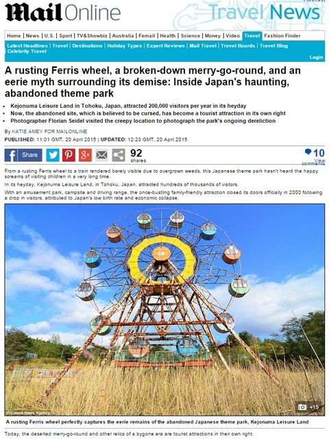 英デイリー・メール紙は、東北の化女沼(けじょぬま)レジャーランドに注目。1979年に開園し、遊園地、キャンプサイト、ゴルフ練習場を備え、かつては年間20万人もの来園者でにぎわったテーマパークが、出生率低下と景気の低迷で2000年に閉園し、廃虚と化したと説明する。