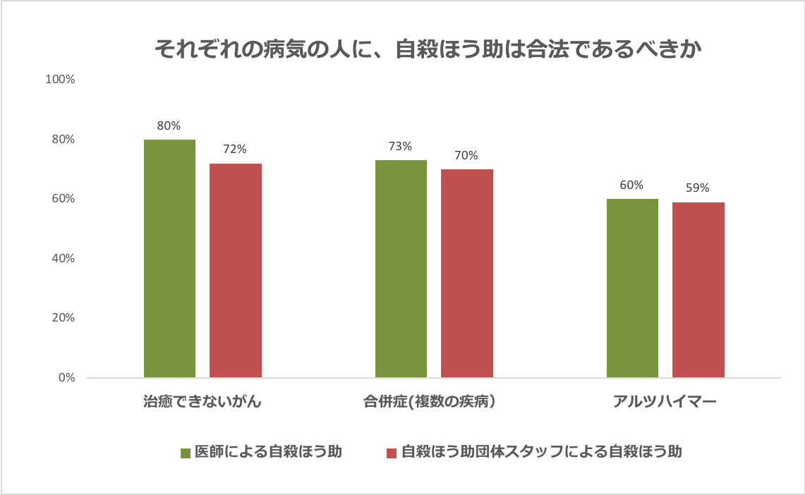 「自殺ほう助は合法であるべきか」という質問では、下のグラフのように、①治癒できないがんの人と②合併症(複数の疾病)の人へは、医師や自殺ほう助団体スタッフによる自殺ほう助は合法であるべきだと70%以上が答えた。