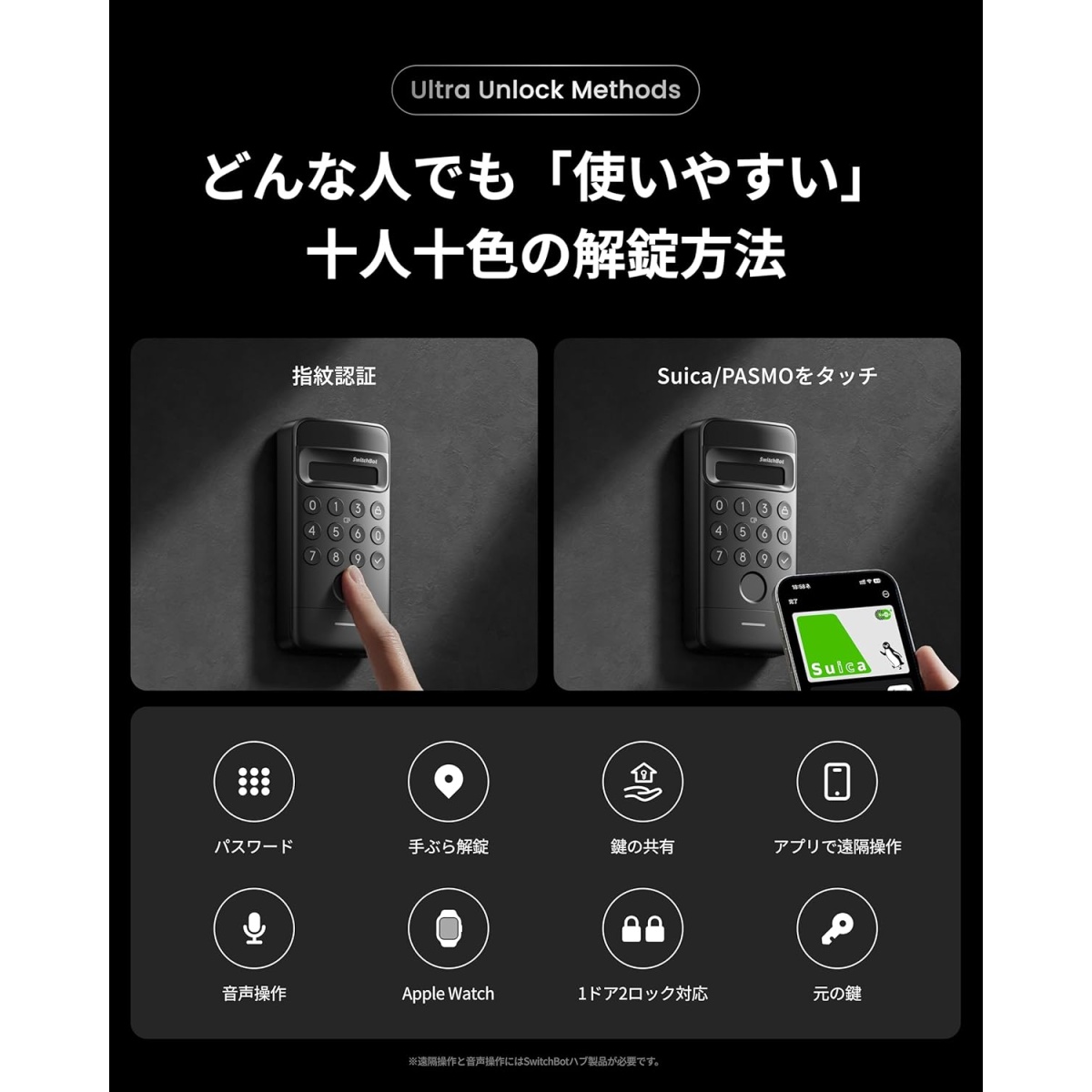 「Ultra」モデルの特徴は、3D顔認証/指紋認証/暗証番号/Suicaなどのカード対応と、解錠方法の豊富さにあります。