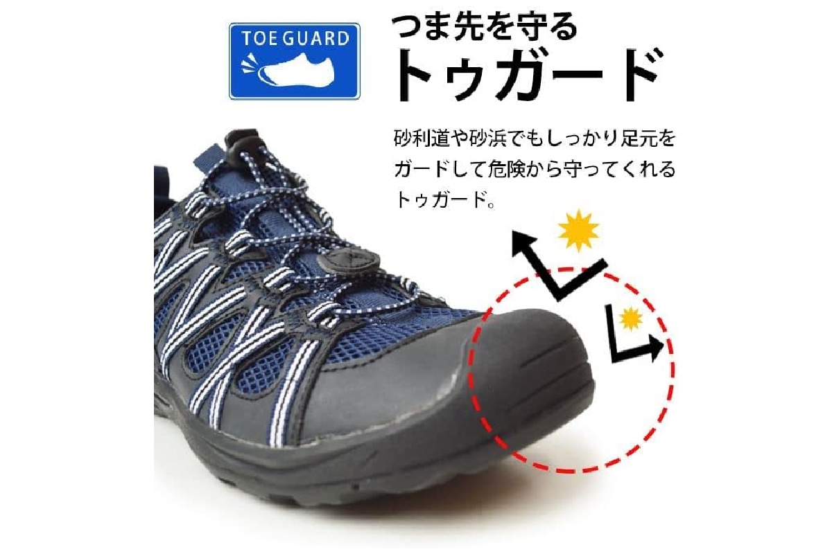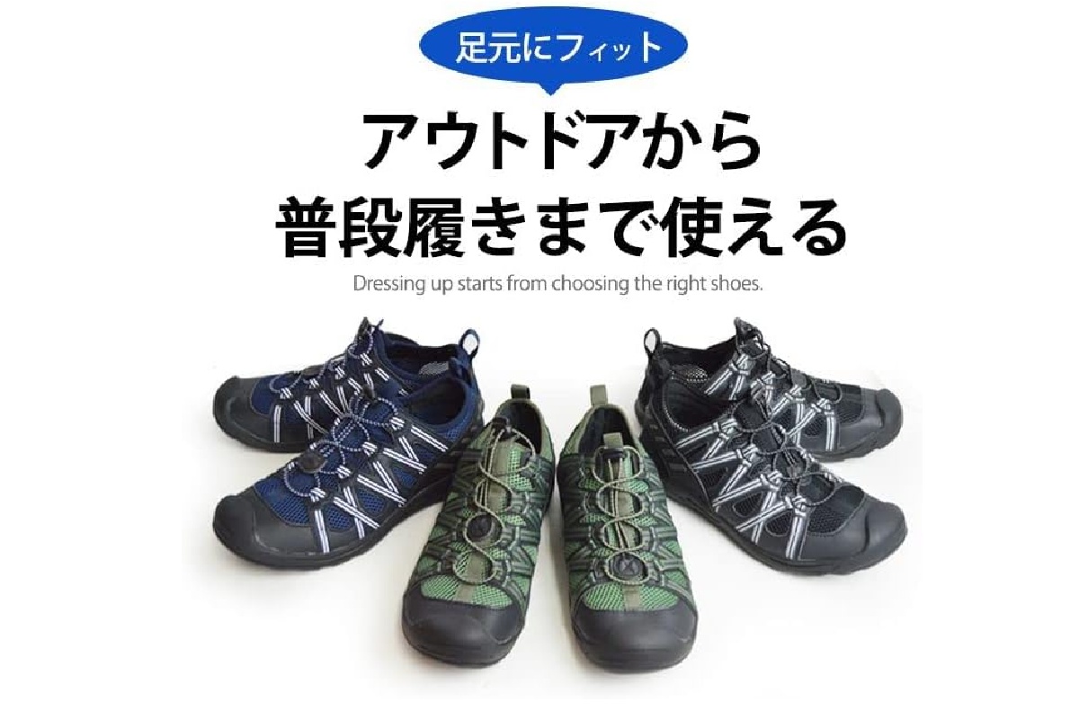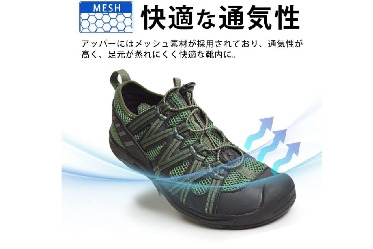 通気性が良いことから夏場の使用や水辺でのアクティビティにも適しており、サンダルとスニーカーの中間のような感覚で使えるのも特徴です。