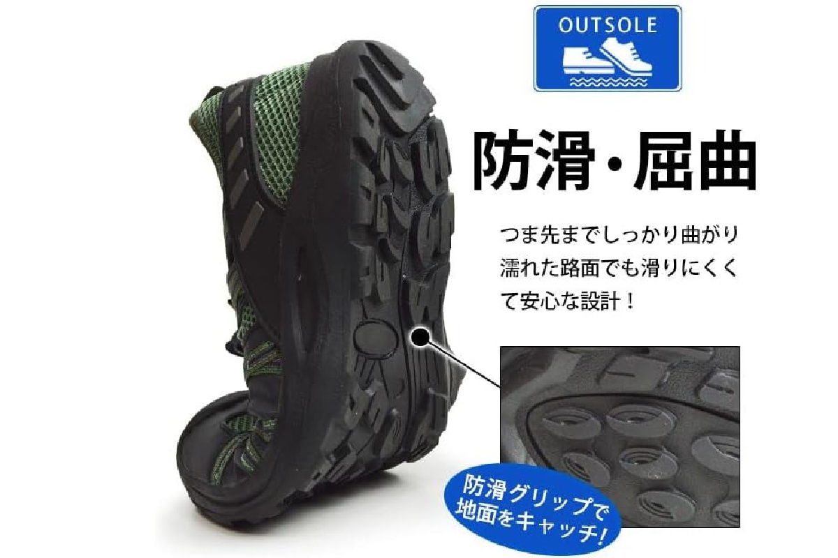 ソールはエチレン酢酸ビニルで作られており、防滑仕様になっているため、アウトドアシーンでも安心感があります。