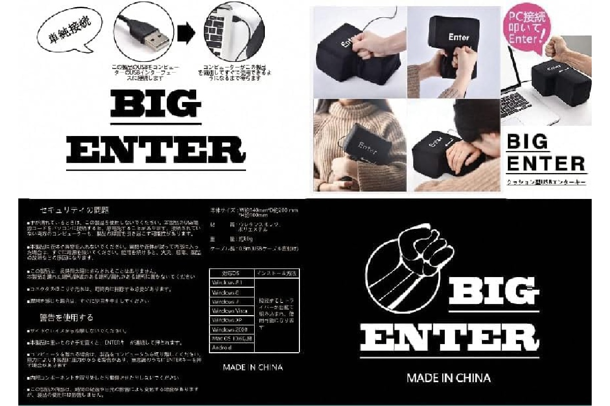 USBでパソコンに繋げば、実際にEnterキーとして動作するから、ストレスを解消しながら仕事もできてしまう、という不思議なアイテムです。