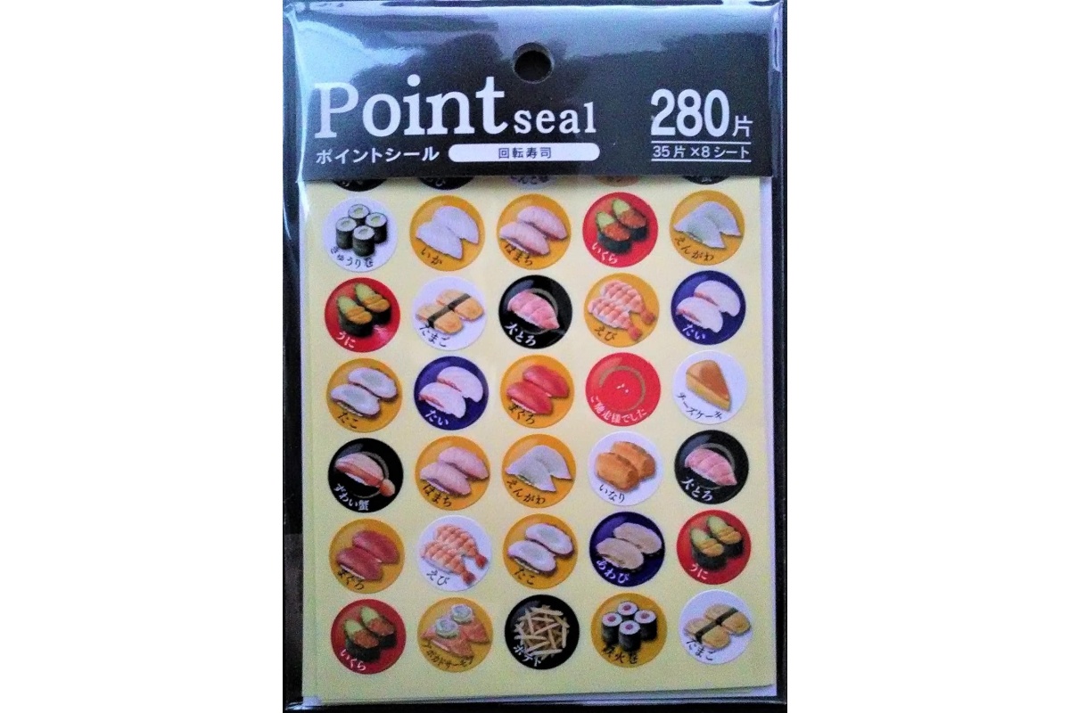 「協和紙工 回転寿司ポイントシール」は、リアルでかわいい寿司デザインが並ぶ人気のシールセットです。