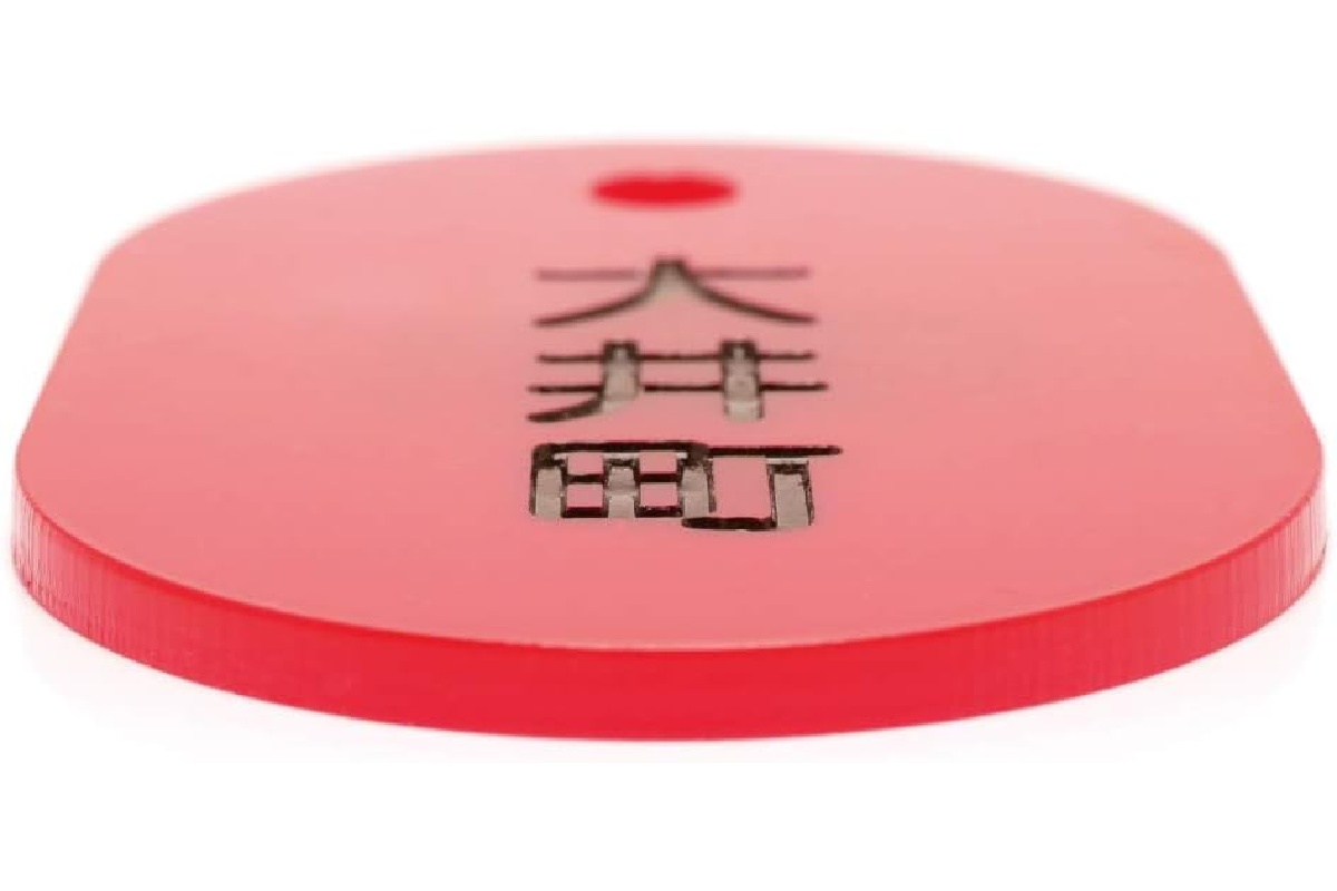 昭和のコインロッカーや銭湯の札を思わせるレトロデザインで、真っ赤なアクリルプレートに“街の名前”が刻まれた、どこか温かみのあるアイテム。