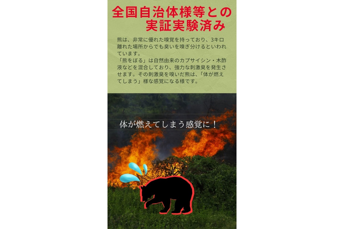 特許を取得したカプサイシンと木酢液を配合し、自然由来ながらも強力な刺激臭を発してクマを寄せつけにくくします。