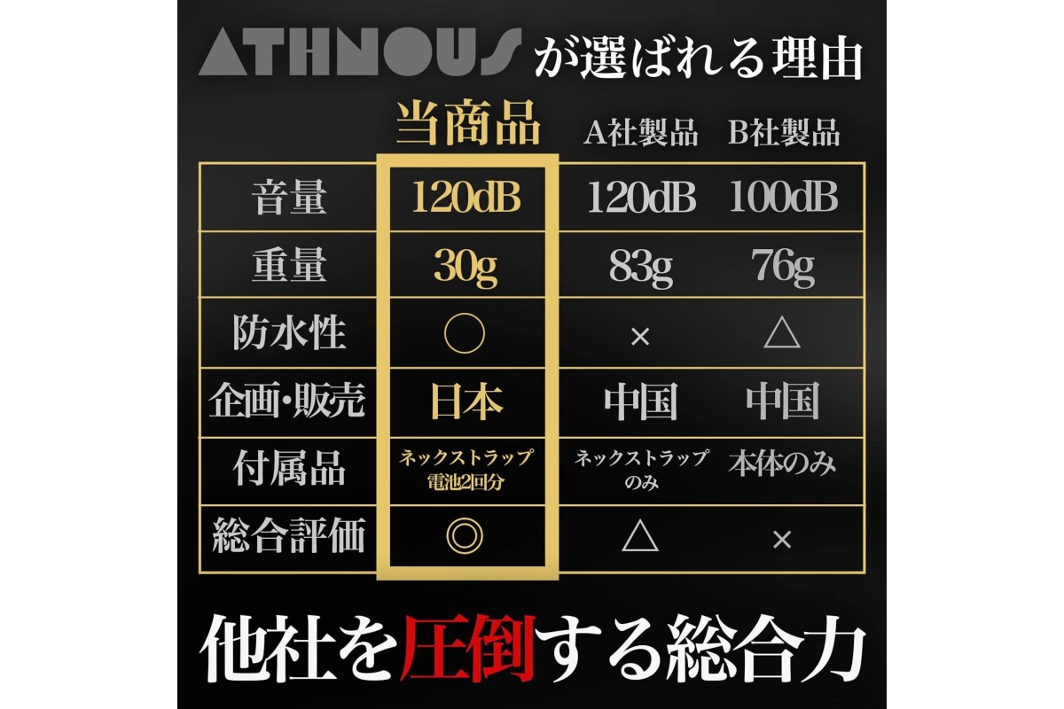 ATHNOUSの電子ホイッスルは、軽量で扱いやすく、アウトドアや防犯用途に幅広く使えるアイテムです。