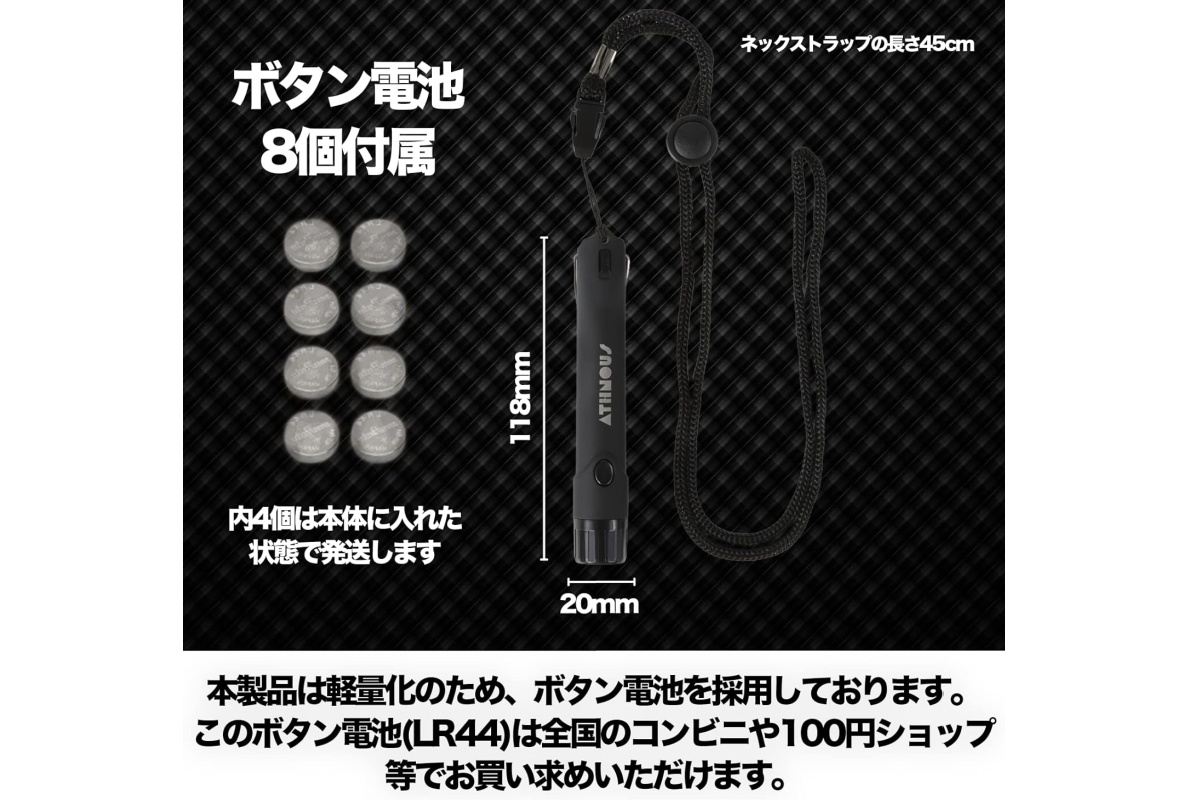 付属品は電子ホイッスル本体、ネックストラップ、そしてボタン電池4個(うち2個は予備)です。
