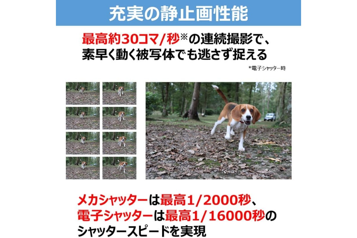電子シャッターで最高約30コマ毎秒の高速連写が可能なため、一瞬の動きを逃さず記録できます。