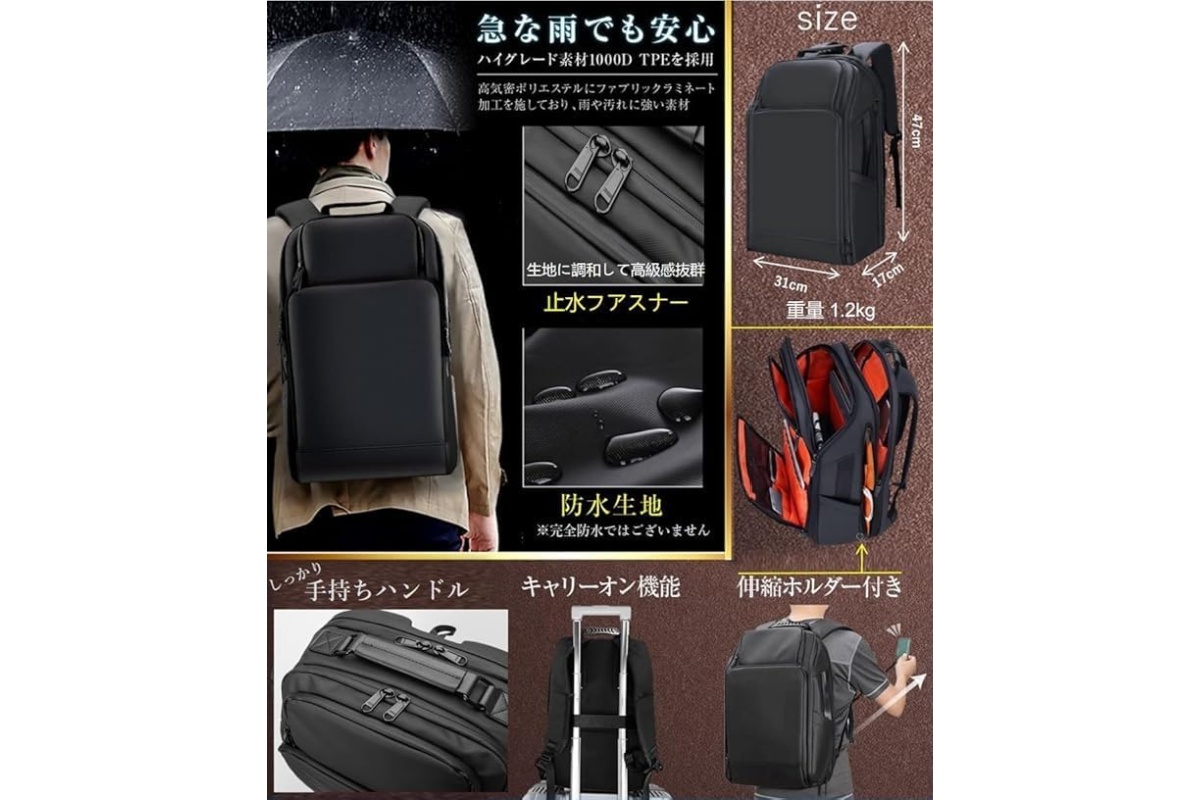 このバックパックは、仕事から日常使い、出張まで幅広い場面に対応できる収納力と使いやすさが特徴です。