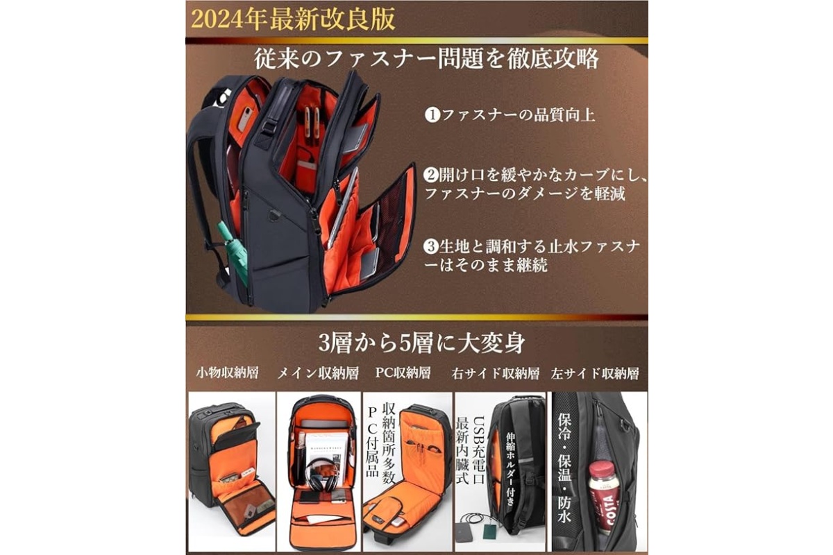 収納力、機能性、耐久性のバランスがよく、実用性を重視する人にとって使いやすいバックパックです。