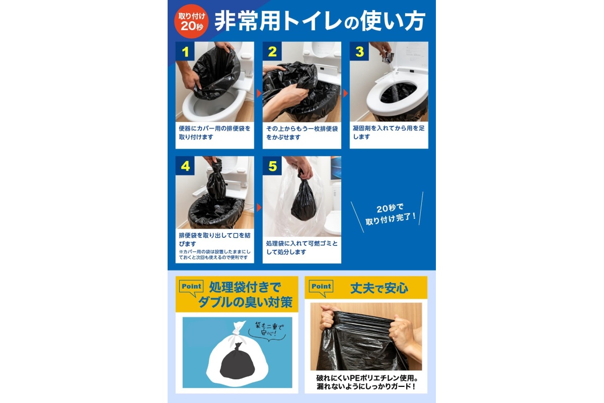 使い方はシンプルで、便器やバケツにセットして使用し、処理袋で密閉して処分する流れです。