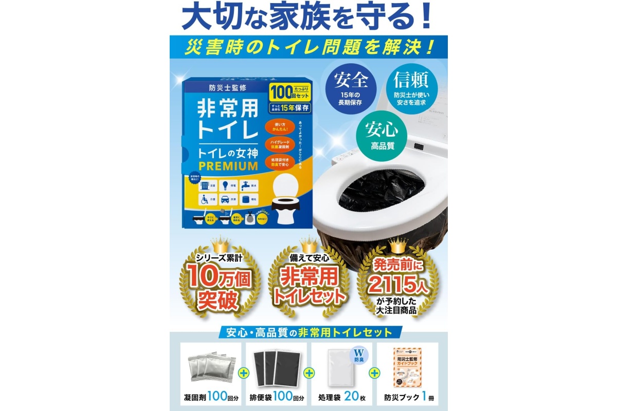 トイレの女神PREMIUMは、災害時や断水時に備えておきたい簡易トイレセットです。